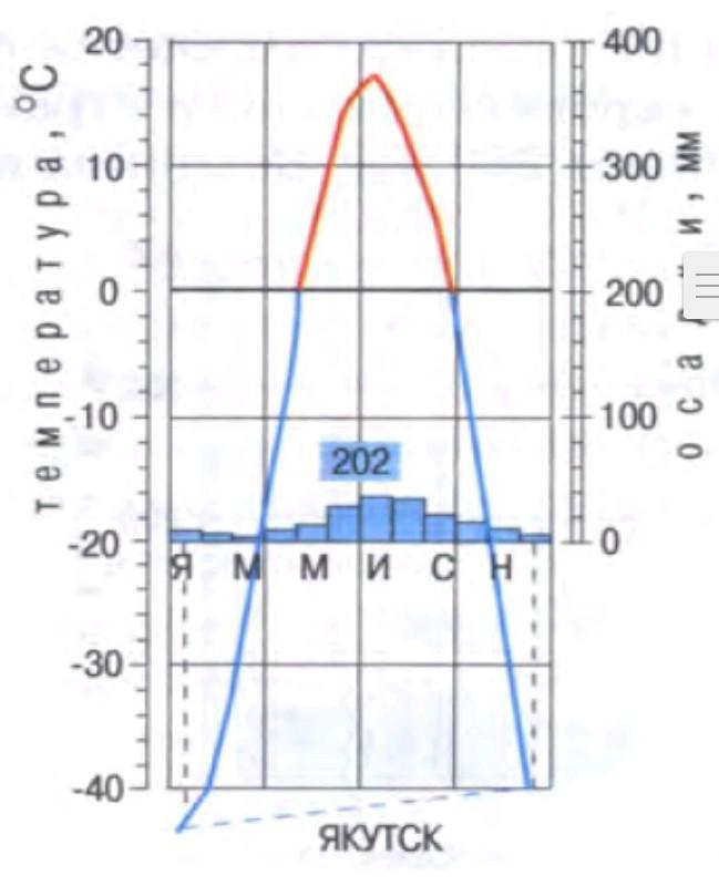 Рассмотрите климатограмму Якутска, определите тип климата, характерный для города, и 2 причины, которые обусловили распространение многолетней мерзлоты.