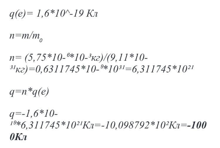 Определите суммарный заряд электронов, если их общая масса m=4,96⋅10−6 г. Масса одного электрона m0=9,11⋅10−31 кг