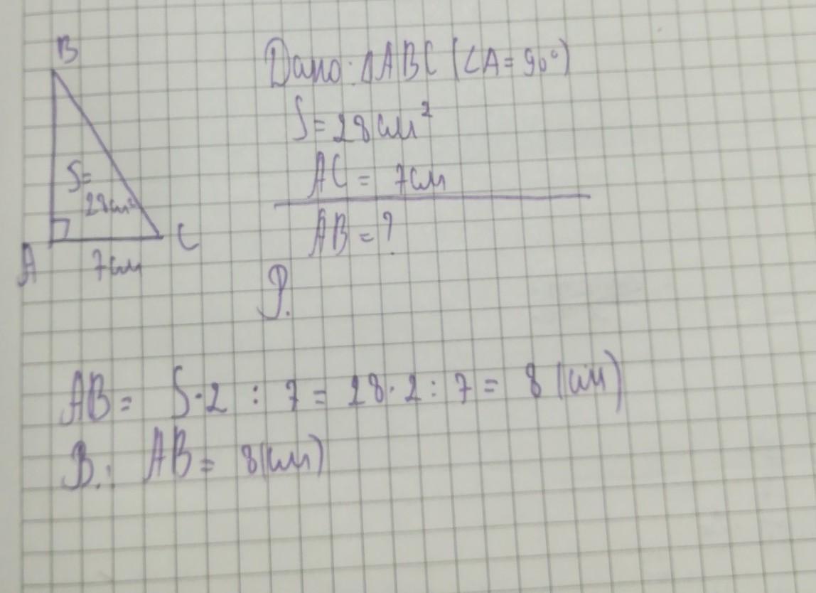 Площа прямокутного трикутника дорівнює 28 см2, а один з катетів – 7 см. Знайдіть довжину іншого катета.