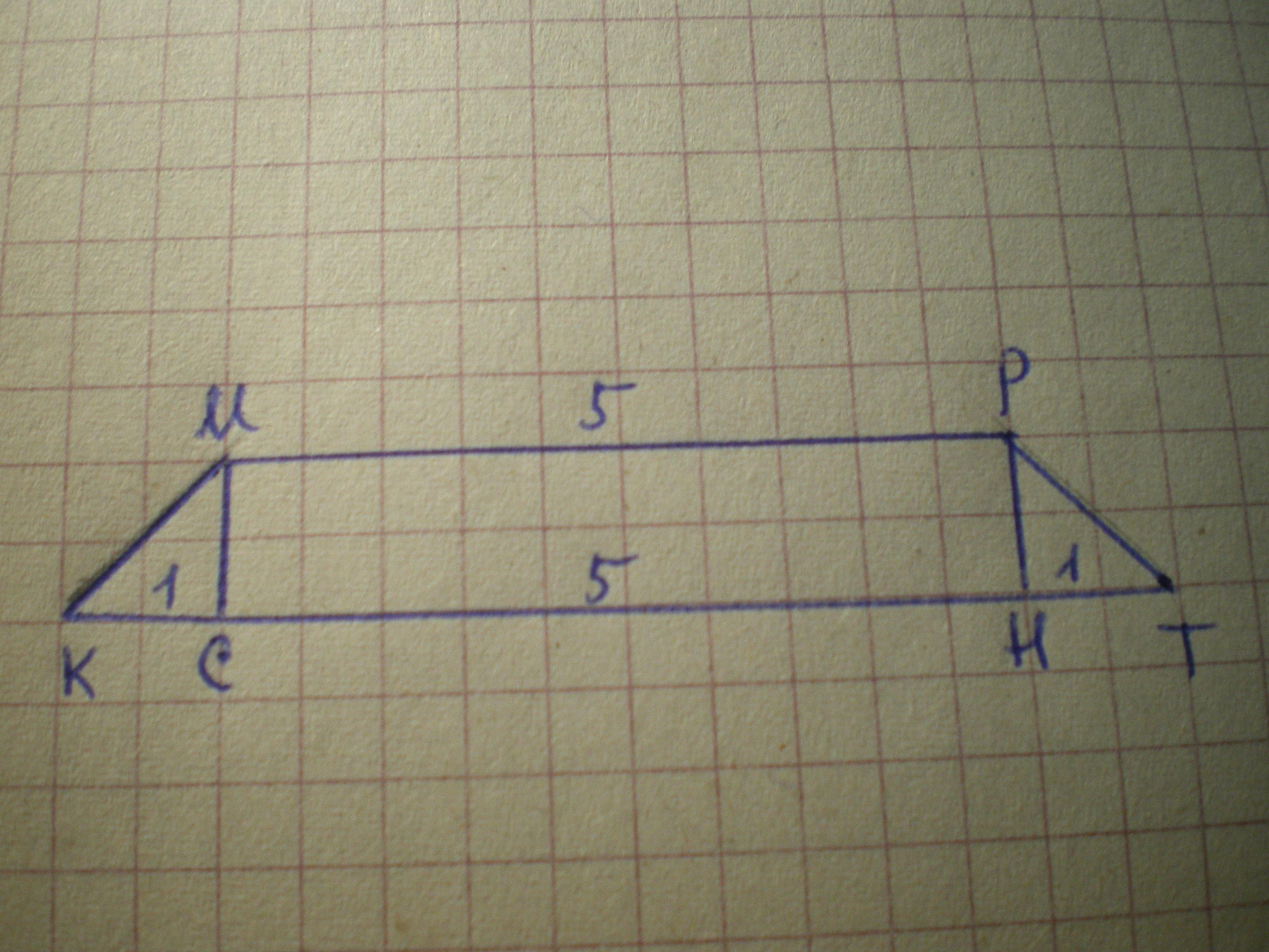 Дано: КМРТ - трапеція, КМ=РТ, МР=5 см, КТ=7 см, ∠Т=45°. Знайти S.