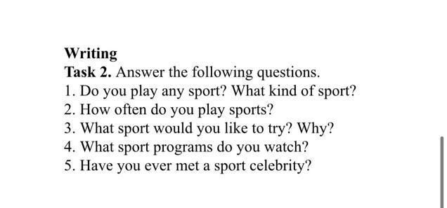1. Yes, I do gymnastics. 2. I do gymnastics three times a week. 3. I would like to try karate. 4. I do not watch sports programs. 5. Yes, I once met Margarita Mamun.
