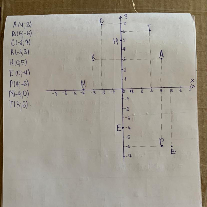 позначте на координатній площині точки А (4;3), В(5;-6), С(-2;7), К(-3;3), Н(0;5), Е(0;-4), Р (4;-6), М(-4;0), Т(3;6).