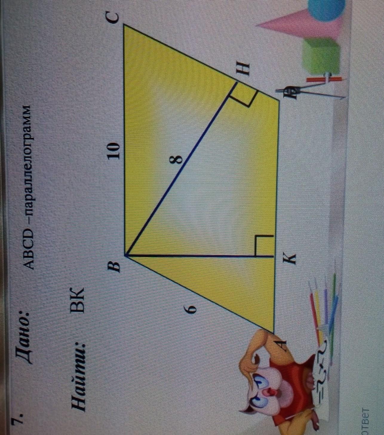Эту площадь можно выразить S=BH*CD или через другую высоту и другое основание S=BK*AD,но так это одна и та же площадь ,то получим решение внизу