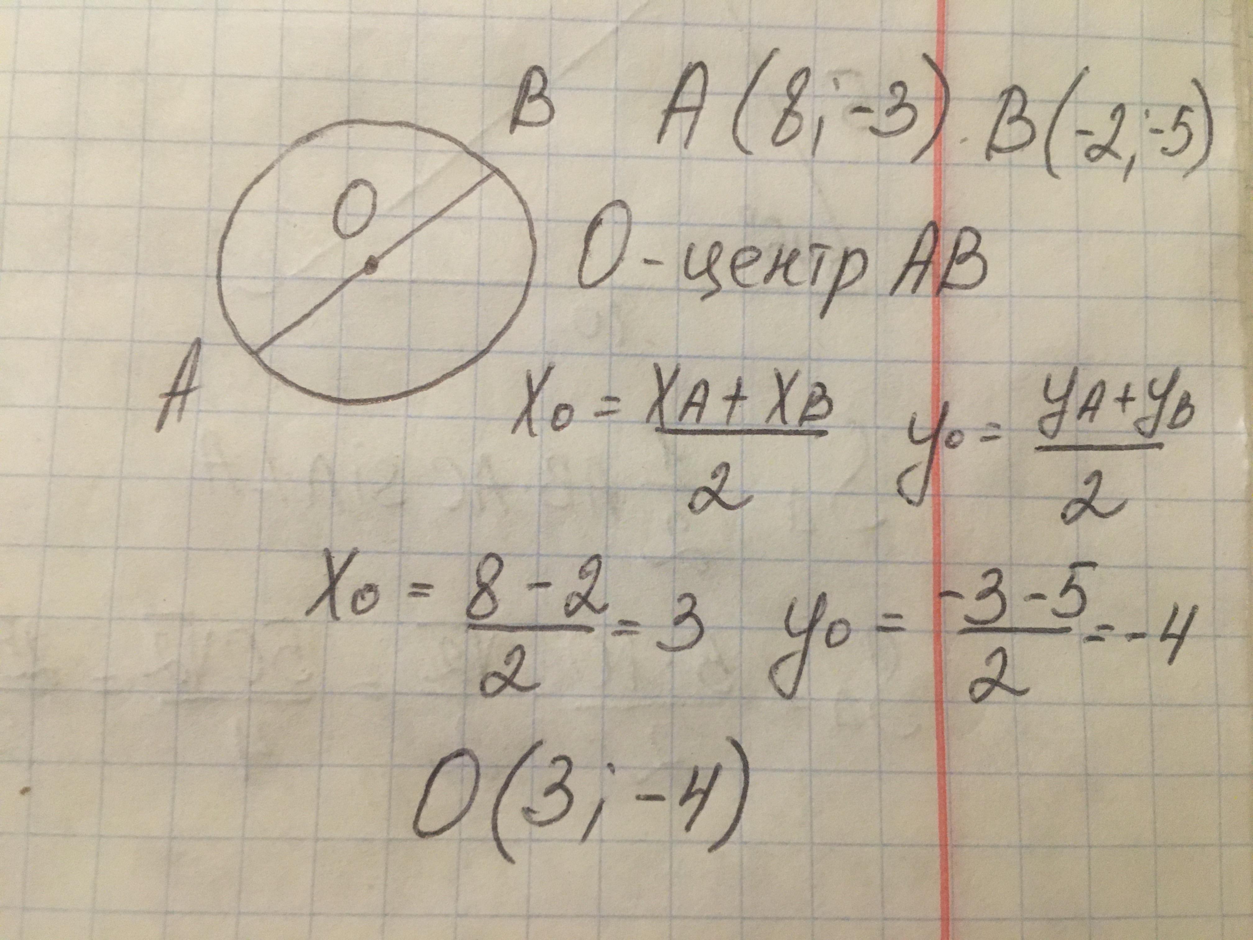 АВ - диаметр окружности с центром О. Найти координаты центра окружности, если А(8,-3)и В(-2,-5)