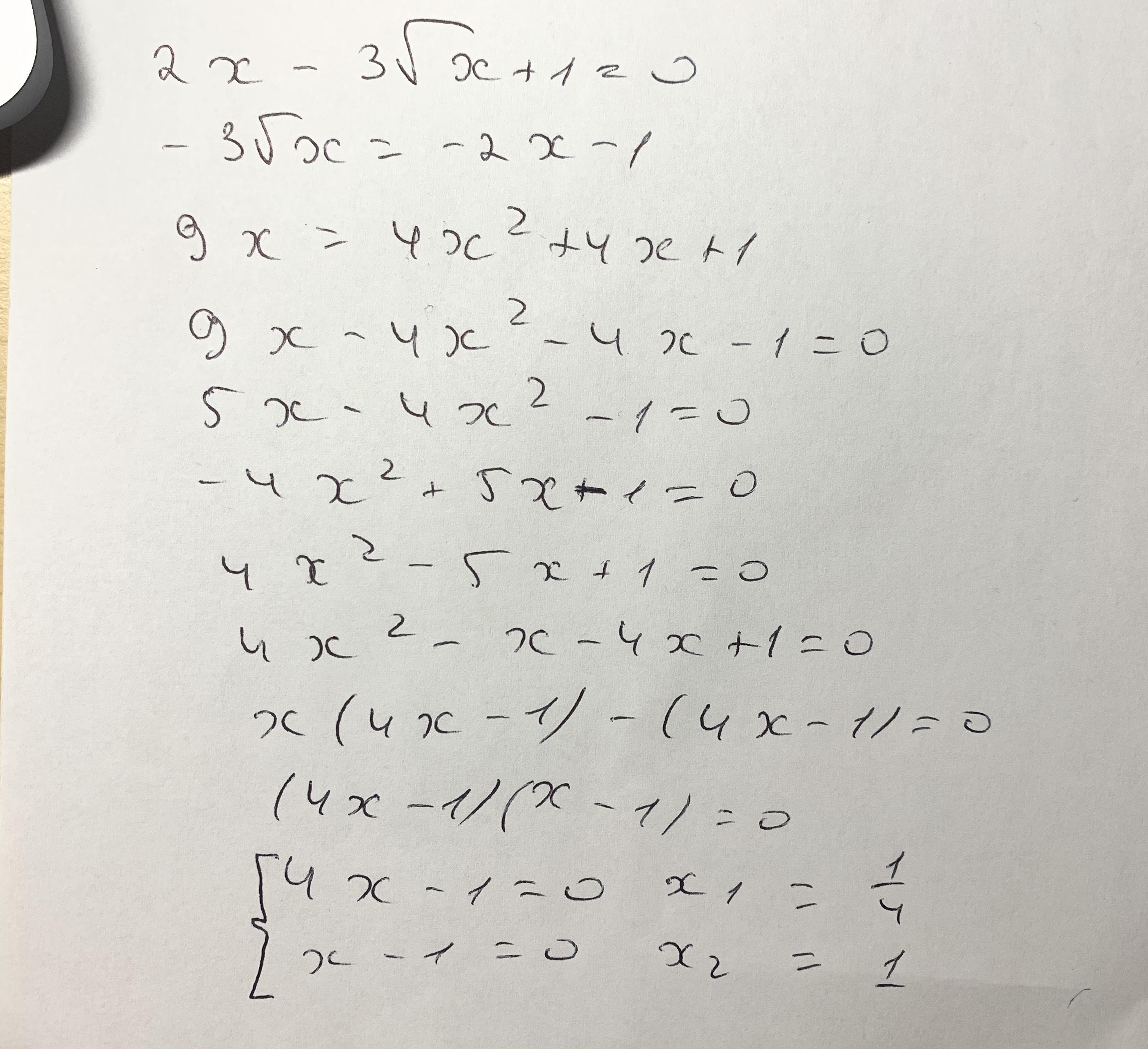2t^2-3t+1=0, D=1, корни 1 и 1/2, Vx=1, x=1, Vx=1/2, x=1/4