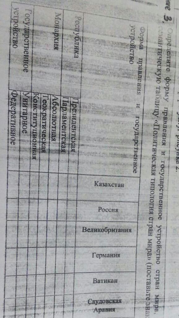 Ответ: Казахстан - Республика, Россия - Государственное Устройство, Великобритания - Монархия, Германия - Республика, Ватикан и Саудовская Аравия - Монархия.
