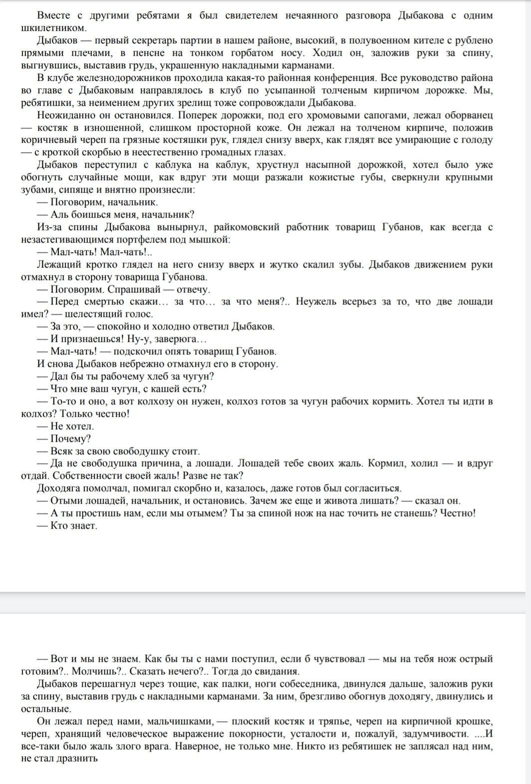 По утрам в привокзальный березняк ездил конюх Абрам «собирать падалицу» – мертвых куркулей. Живых он не трогал, а трупы складывал «в телегу, как дровяные чурки». Затем начиналась обыденная поселковая жизнь.