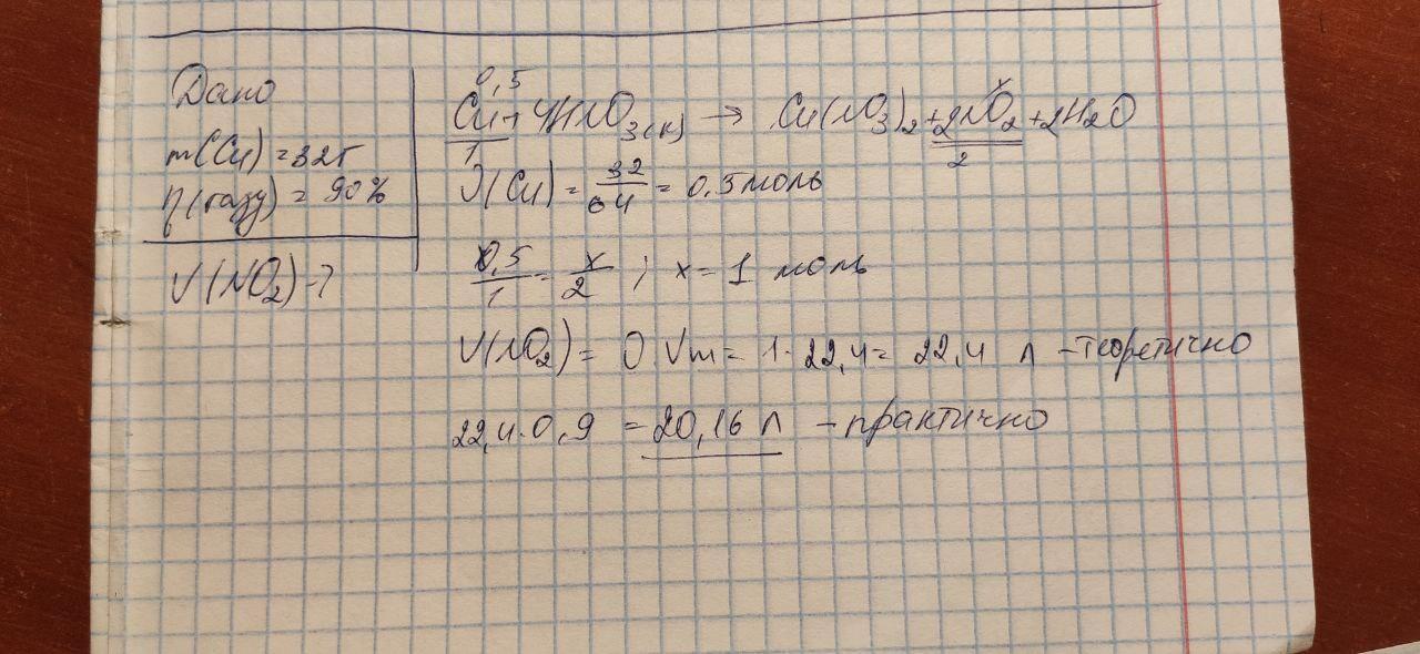 До концентрованої нітратної кислоти добавили мідні ошурки масою 32г. Який об'єм нітроген(|V) оксиду виділився, якщо вихід газу становить 90%.