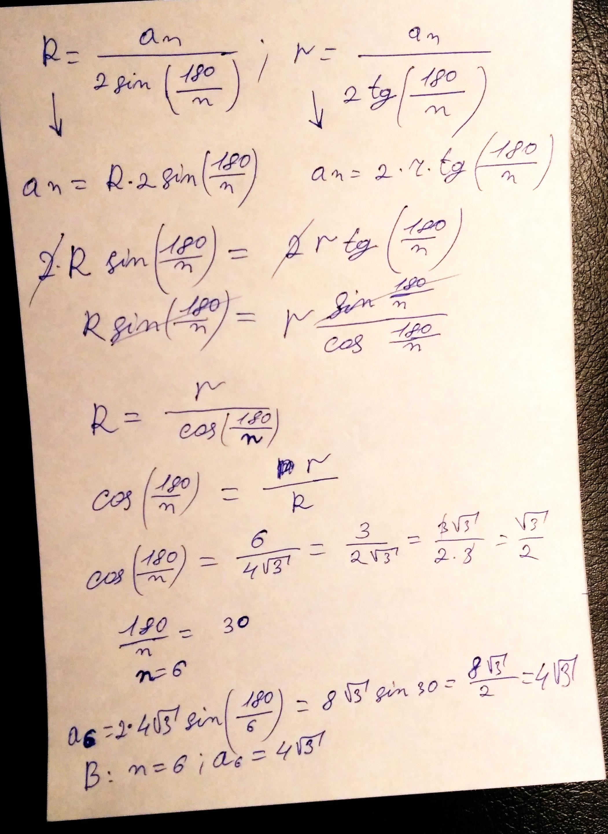 Радіус кола описаного навколо правильного многокутника дорівнює 4корінь 3см, а радіус кола вписаного в нього, - 6см. Знайдіть кількість сторін многокутника та довжину його сторони. Пж пж