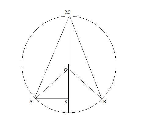 ΔОАВ-равнобедренный,т.к. ОА=ОВ образующие малого конуса ⇒ОА=ОВ=R и ОА=ОВ=ОМ=R.