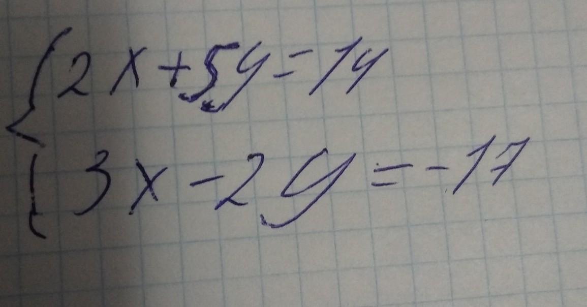 Перетворимо систему таким чином:перше рівняння помножимо на -3, друге на 2 , отримаємо: -6х-15у=-42
