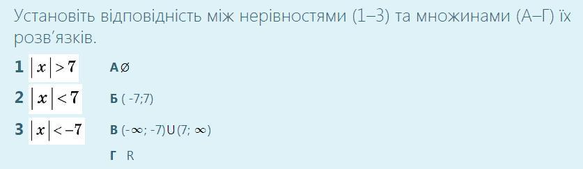 Установіть відповідність між нерівностями (1–3) та множинами (А–Г) їх розв’язків.