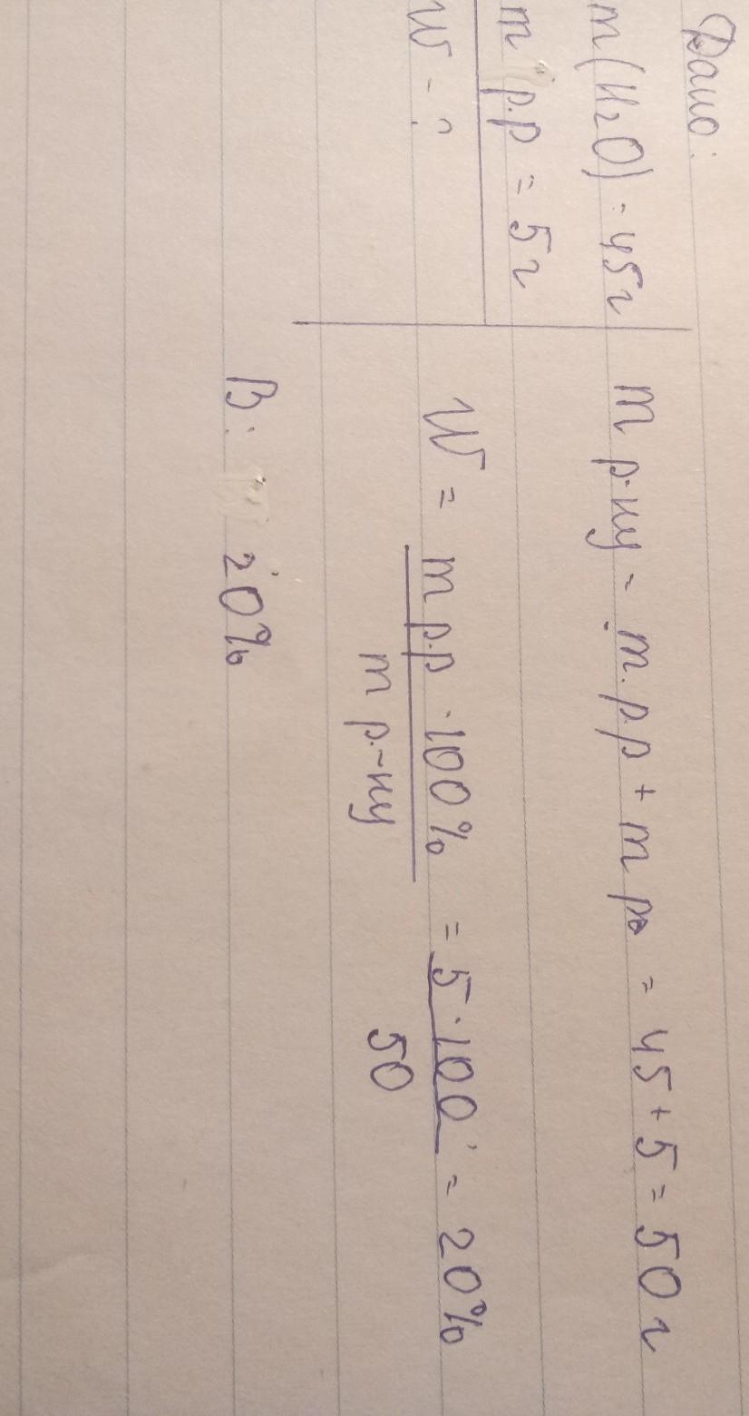 20б. срочно сейчас !!!!!!Умоляю помогите !!!!!!!змішали 45 грамів води та 5 грамів цукру. визначте масову частку цукру в отриманому розчині.