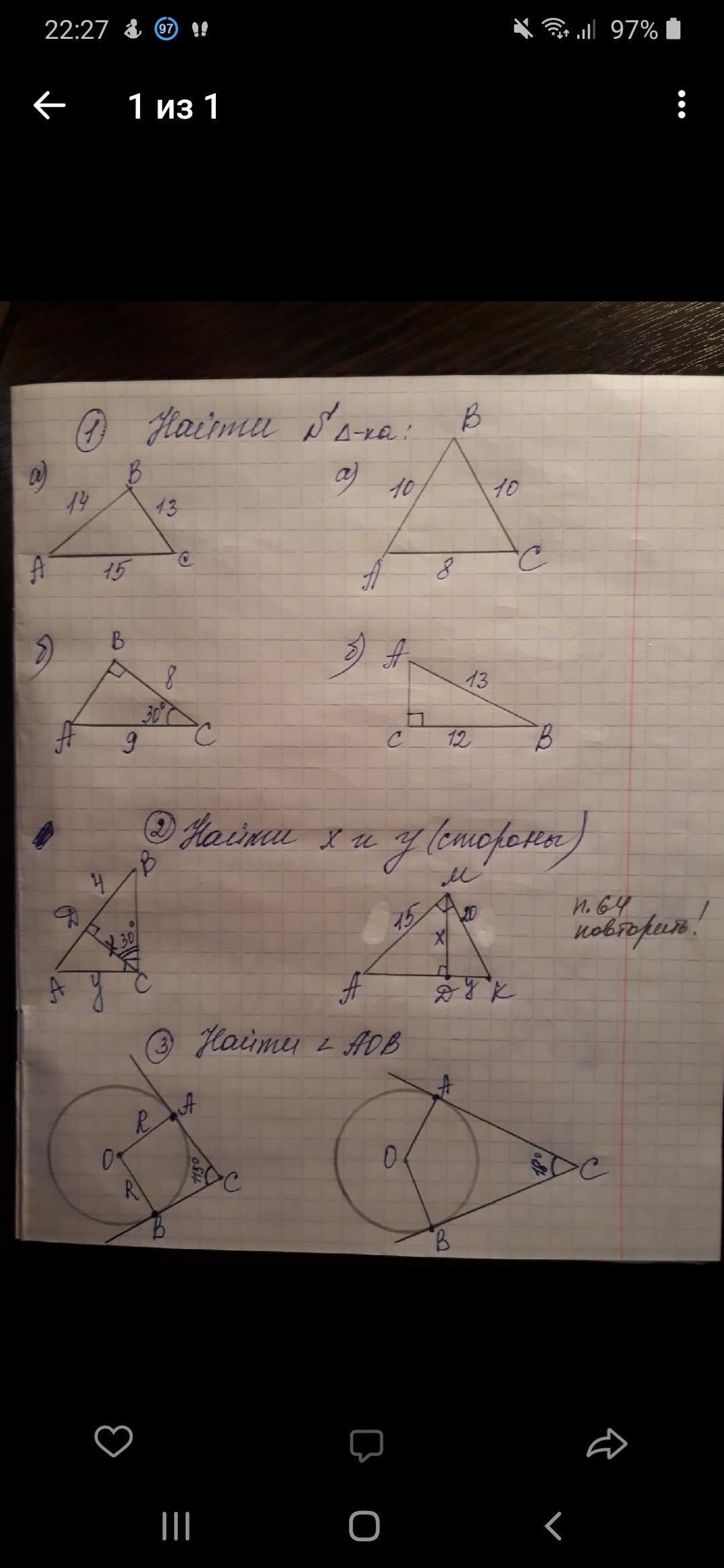 г) Проведём отрезок ОС. Треугольники ОАС и ОВС - прямоугольные, т.к. касательные к окружности перпендикулярны радиусам ОА и ОВ, проведенным в точки касания. Значит, углы ОАС и ОВС равны 90°. ОАСВ - четырёхугольник, сумма всех его углов равна 360°. Следовательно, угол АОВ = 360-90-90-115 = 65°.