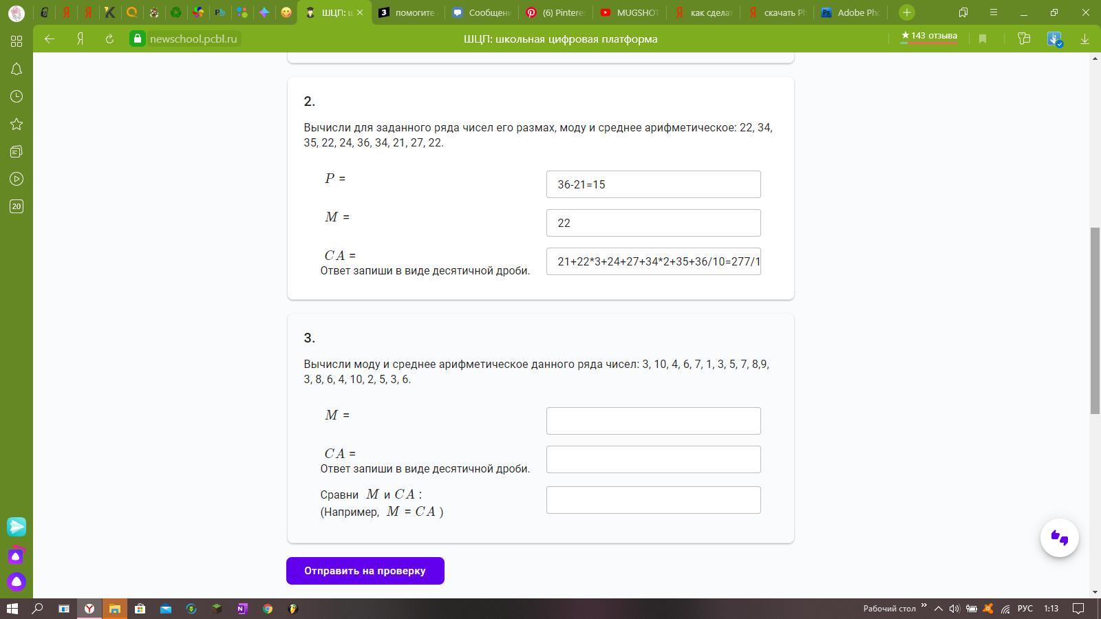 СА = 22 + 34 + 35 + 22 + 24 + 36 + 34 + 21 + 27 + 22 = 277 : 10 = 27,7