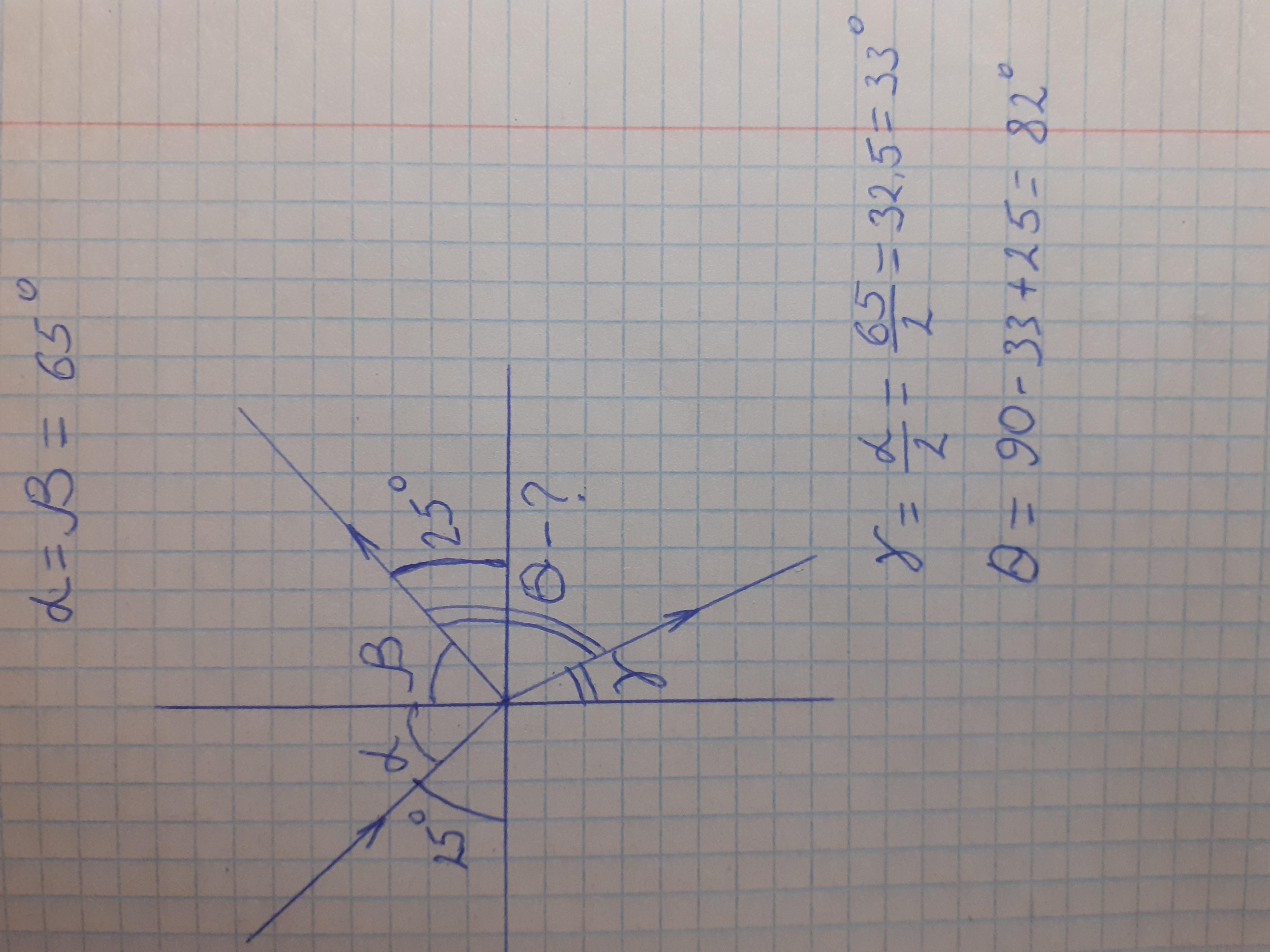 Найди угол между отражённым и преломлённым лучом, падающим на границу раздела двух сред, если угол падения луча равен α = 65°, а угол преломления в два раза меньше угла падения.