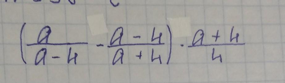 ( frac{a}{a - 4}  -  frac{a - 4}{a + 4} ) times  frac{a + 4}{4}  =  frac{a(a + 4) - (a - 4) {}^{2} }{(a - 4)(a + 4)} times  frac{a + 4}{4} =  frac{ {a}^{2}  + 4a - (a {}^{2} - 8a + 16) }{4(a - 4)}  =  frac{ {a {}^{2}  + 4a - a {}^{2} }  + 8a - 16}{4(a - 4)}  =  frac{12a - 16}{4(a - 4)}  =  frac{4(3a - 4)}{4(a - 4)}  =  frac{3a - 4}{a - 4}