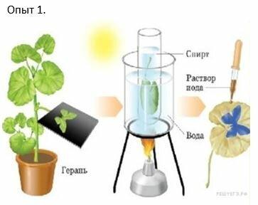 ОПЫТ № 1. В изображённом на рисунке опыте экспериментатор закрыл лист герани с двух сторон черной бумагой так, чтобы была прикрыта только их часть. Днём растение выставляют на свет, а ночью его дополнительно освещают с помощью настольной лампы. Через сутки экспериментатор срезал исследуемые листья. Листья прокипятили в воде, а затем выдерживали в горячем спирте. Затем листья промыли в воде и полили слабым раствором йода.