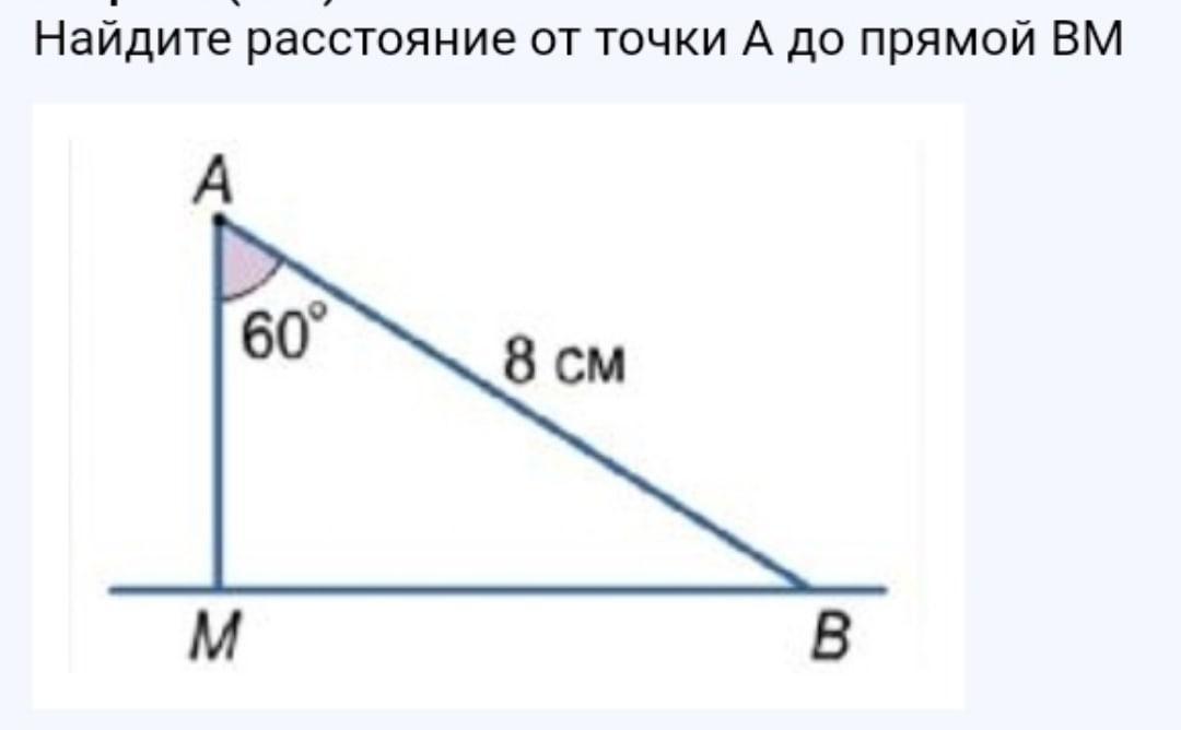 АМ является перепендикуляром к BM, потому и будет являться расстоянием до прямой. Против угла в 30 градусов( угол В, т.к. 180-90-60=30) лежит сторона равная половине гипотенузы.