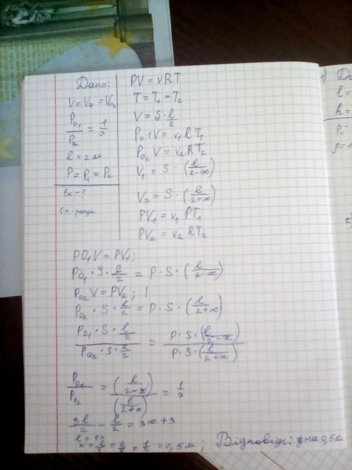 2) Закрытый цилиндрический сосуд высотой 1 м разделен на две равные части тонким невесомым теплонепроницаемым поршнем, скользящим без трения. При застопоренном поршне давление в одной половине в 10 раз больше, чем в другой. На сколько (см) передвинется поршень, если снять стопор. Процесс изотермический.