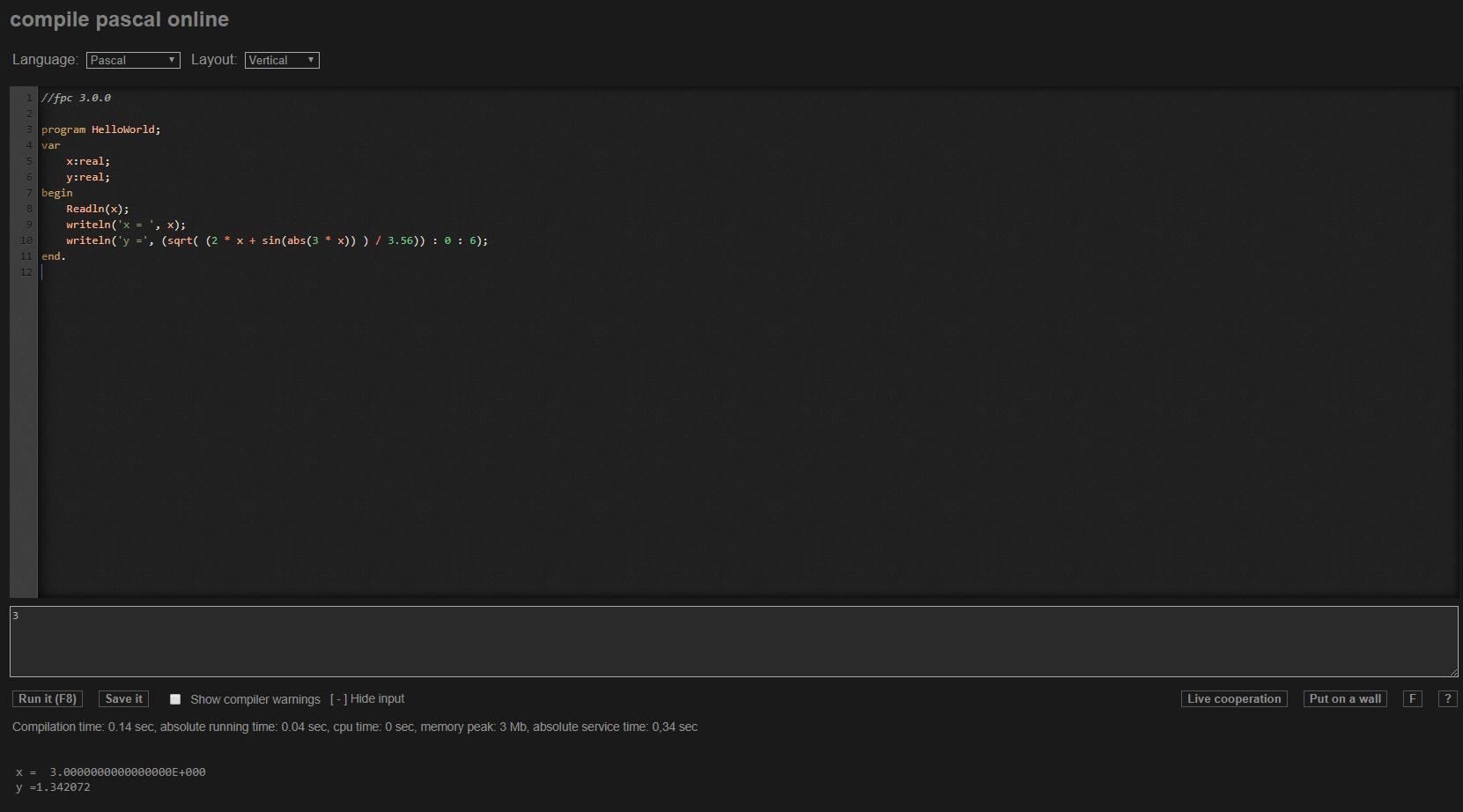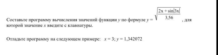writeln('y =', (sqrt( (2 * x + sin(abs(3 * x)) ) / 3.56)) : 0 : 6);