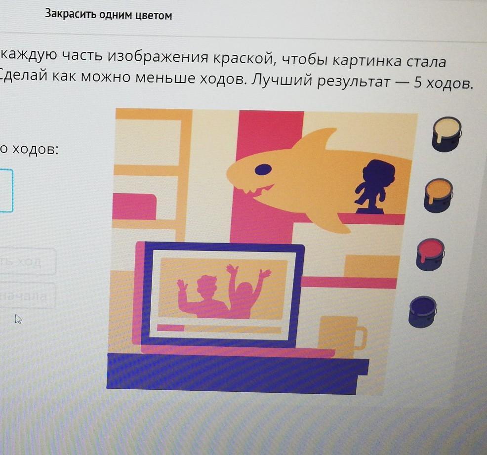 Перекрась каждую часть изображения краской, чтобы картинка стала одноцветной. Сделай как можно меньше ходов. Лучший результат - 5 ходов.
