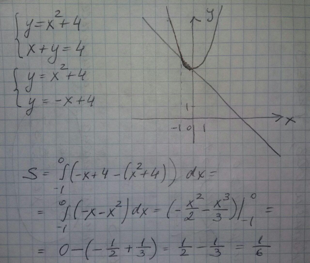 Решение в файле. Границы интегрирования определил графически, хотя можно было их найти, если приравнять две функции и решить уравнение (лайфхак на будущее):