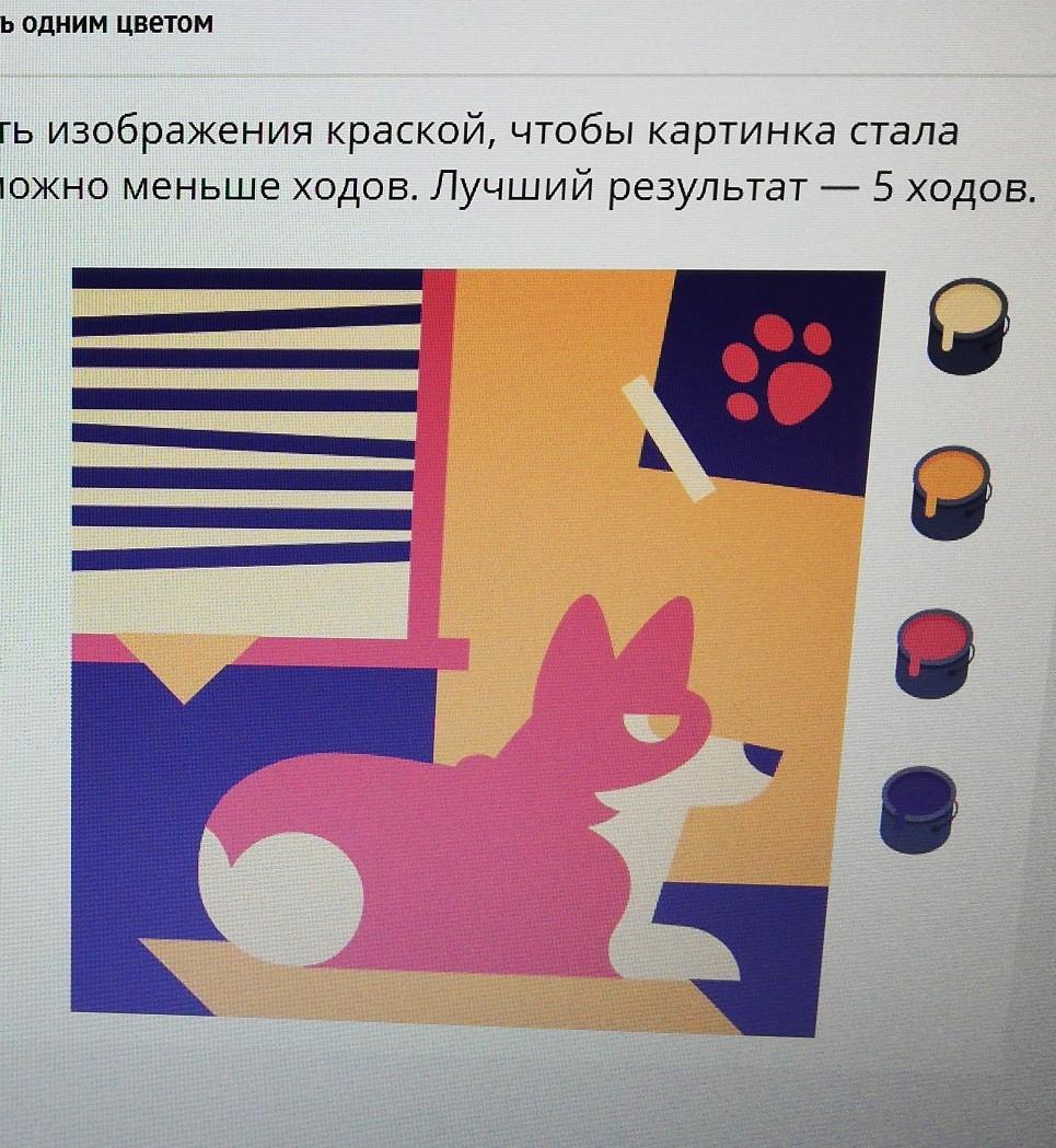 Перекрась каждую часть изображения краской, чтобы картинка стала одноцветной. Сделай как можно меньше ходов. Лучший результат - 5 ходов.