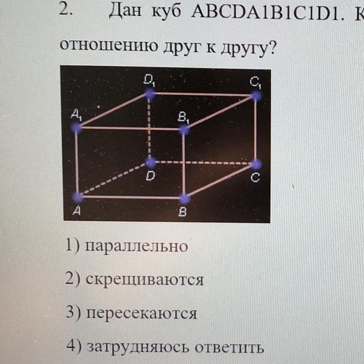 Дан куб АВСDА1В1С1D1. Как расположены прямые BD и AD1 по отношению друг к другу?