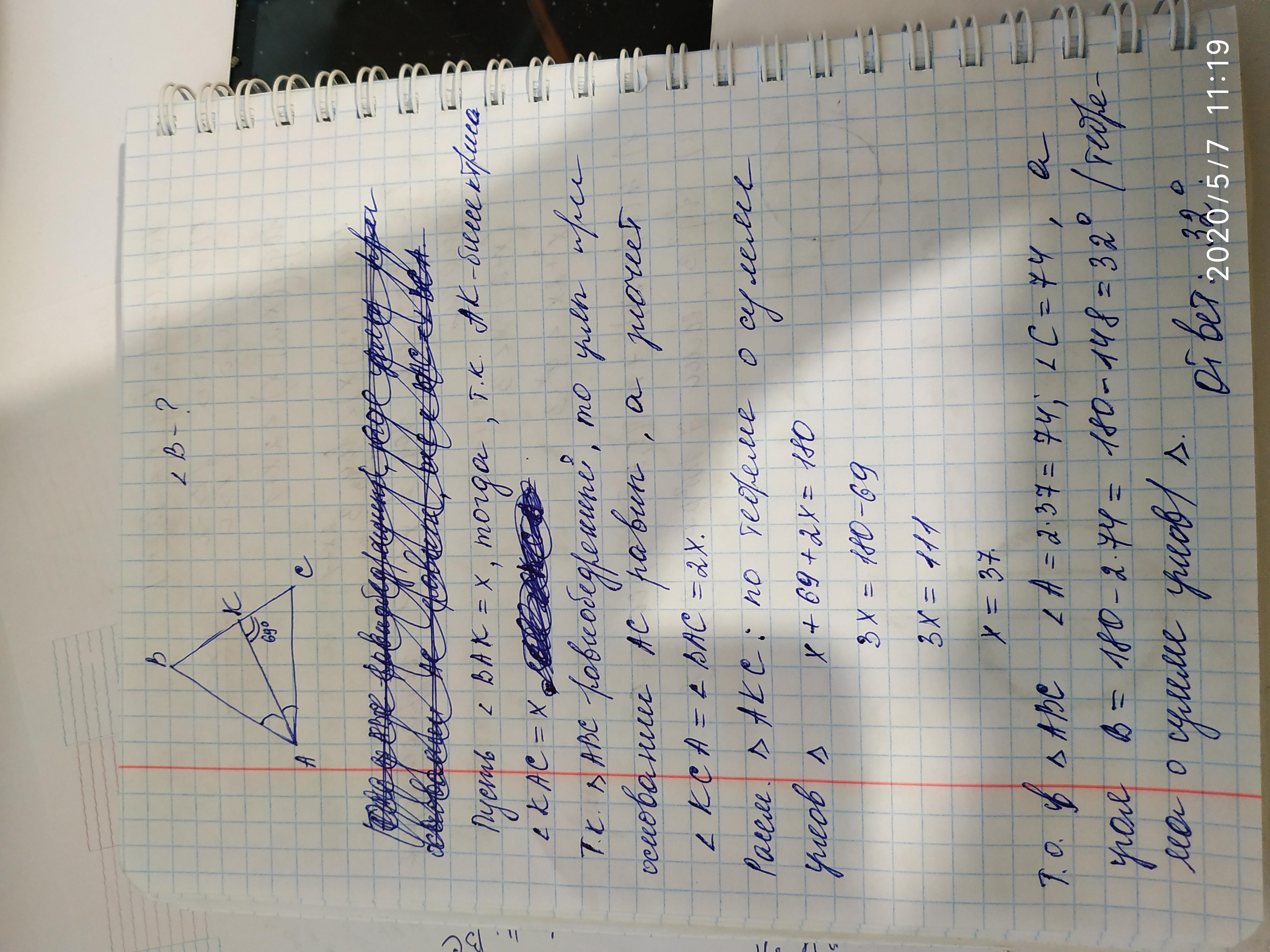 Биссектриса угла при основании АС равнобедренного треугольника АВС образует с его боковой стороной угол 69 так, как это показано на рисунке. Найдите угол этого треугольника при вершине В.