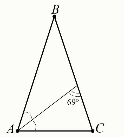 Биссектриса угла при основании АС равнобедренного треугольника АВС образует с его боковой стороной угол 69о так, как это показано на рисунке. Найдите угол этого треугольника при вершине В.