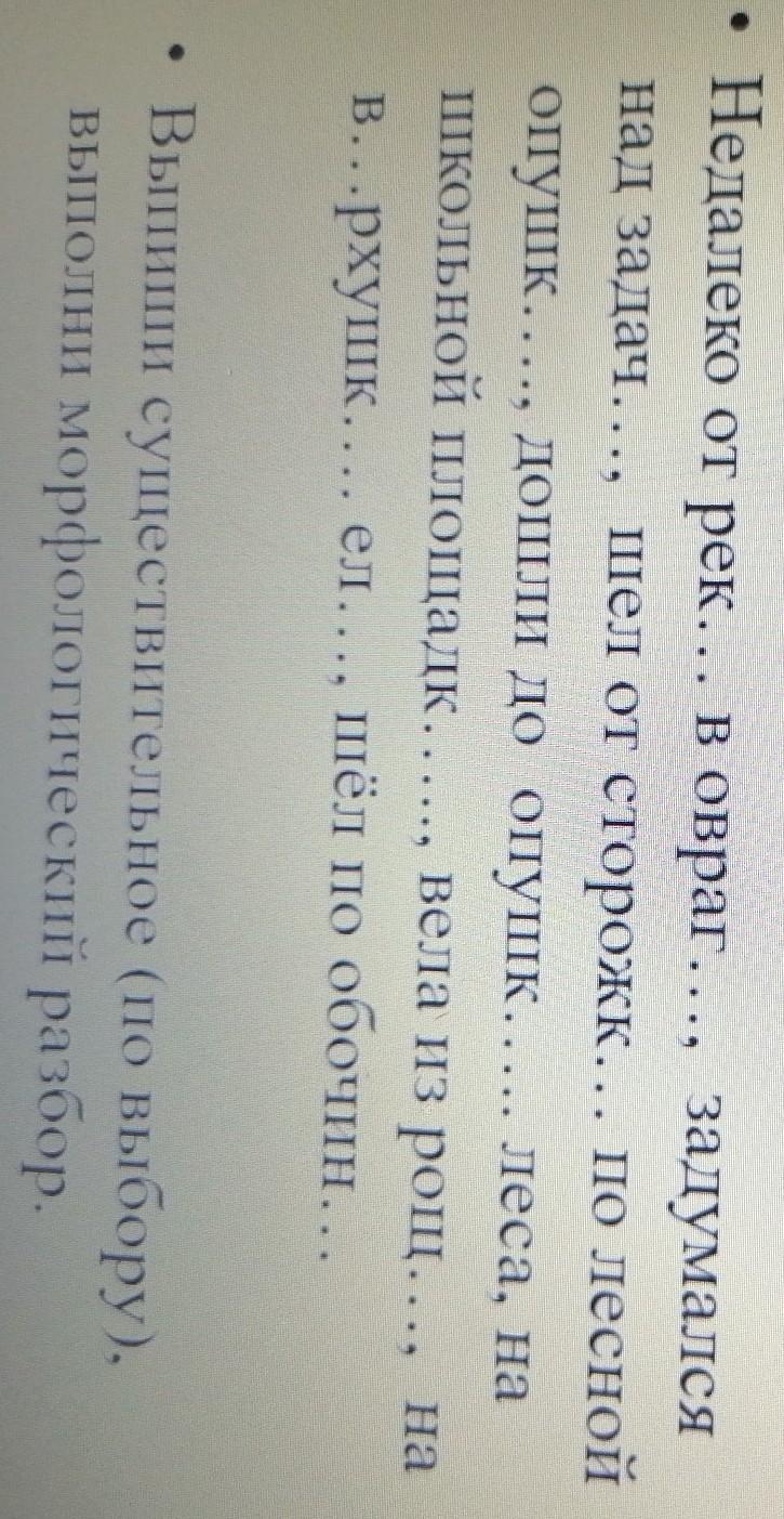 Ответ: недалеко от реки (1 скл, Родительный)в овраге(2скл, Предложный), задумался над задачей (1скл,Творительный), шел от сторожки (1скл, родительный) по лесной опушке (1скл,дательный), дошли до опушки (1скл, родительный) леса, на школьной площадке (1скл, предложный), вела из рощи (1скл, родительный), на верхушке (1скл, предложный) ели (3скл, родительный), шел по обочине (1скл, дательный)