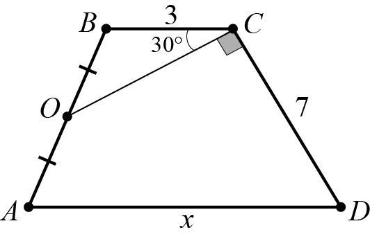 Точка О – середина боковой стороны АВ трапеции АВСD. Известно, что угол ОСВ равен 30о, а угол ОСD прямой. Найдите длину основания АD, если ВС= 3, СD = 7.