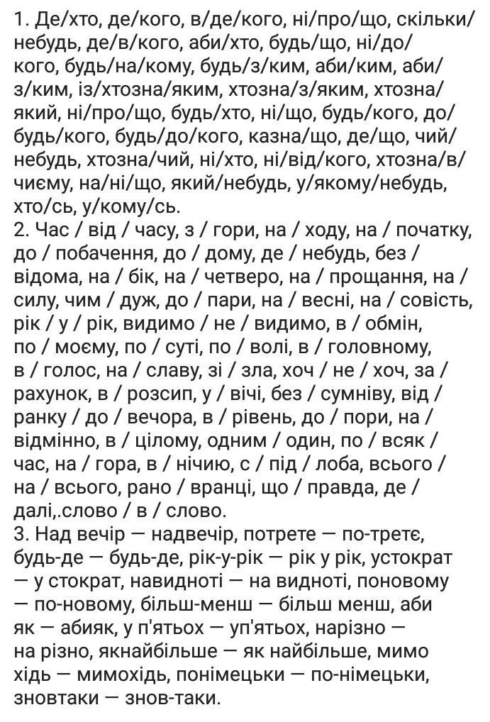 1. дехто, декого, в декого, ні про що, скільки-небудь, дев кого, аби хто, будь-що, ні до кого, будь на кому, будь з ким, аби ким, аби з ким, із хтозна-яким, хтозна з яким, хтозна-який, ні про що, будь-хто, ніщо, будь-кого, до будь-кого, будь до кого, казна-що, дещо, чий-небудь, хтозна-чий, ніхто, ні від кого, хтозна в чиєму, на ніщо, який-небудь, у якому-небудь, хтось, у комусь