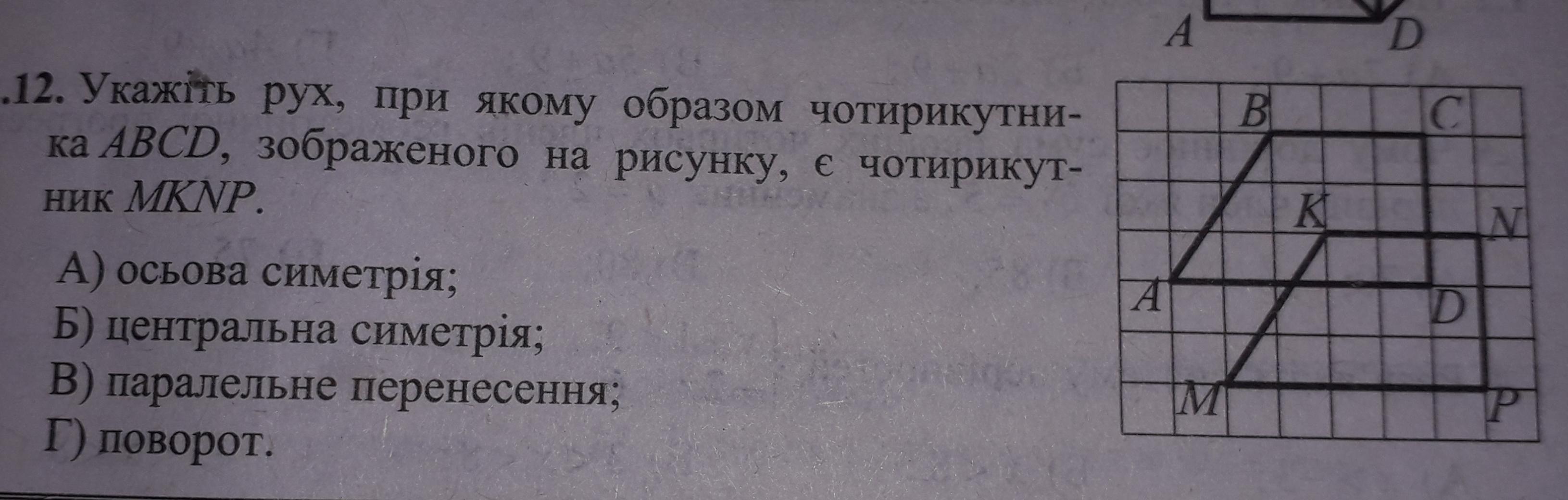 Укажіть рух,при якому образом чотирикутника ABCD,зображеного на рисунку,є чотирикутника MKNP.І чому ,дякую