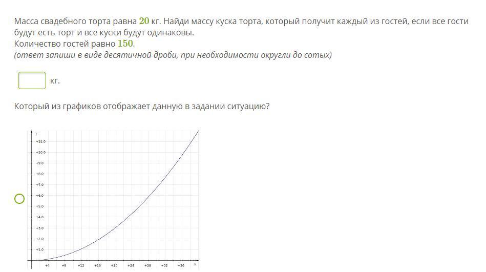 20÷150=2/15 кг съест каждый. 3 ий график будет отображать ситуацию, т.к. это задача на обратную пропорциональность и чем больше будет гостей, тем меньше получит каждый