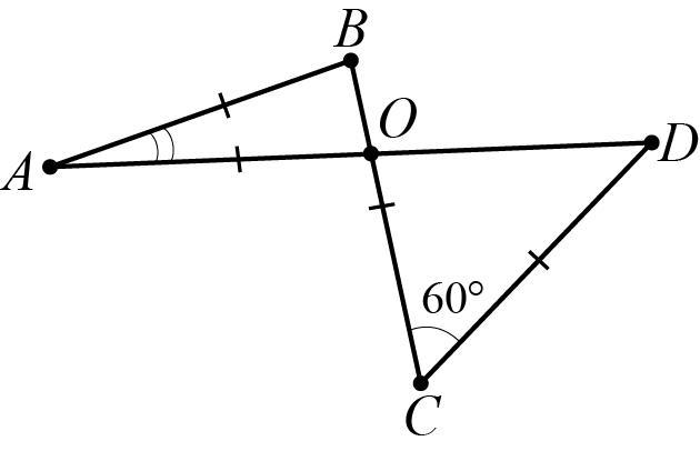 У замкнутой ломаной, показанной на рисунке, звенья ВС и АD пересекаются в точке О. Известно, что АО = АВ = ВС = СD, а угол ВСD равен 60о. Найдите угол ВАD.