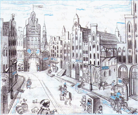 Современный художник изобразил улицу средневекового города. Какие он допустил ошибки ?