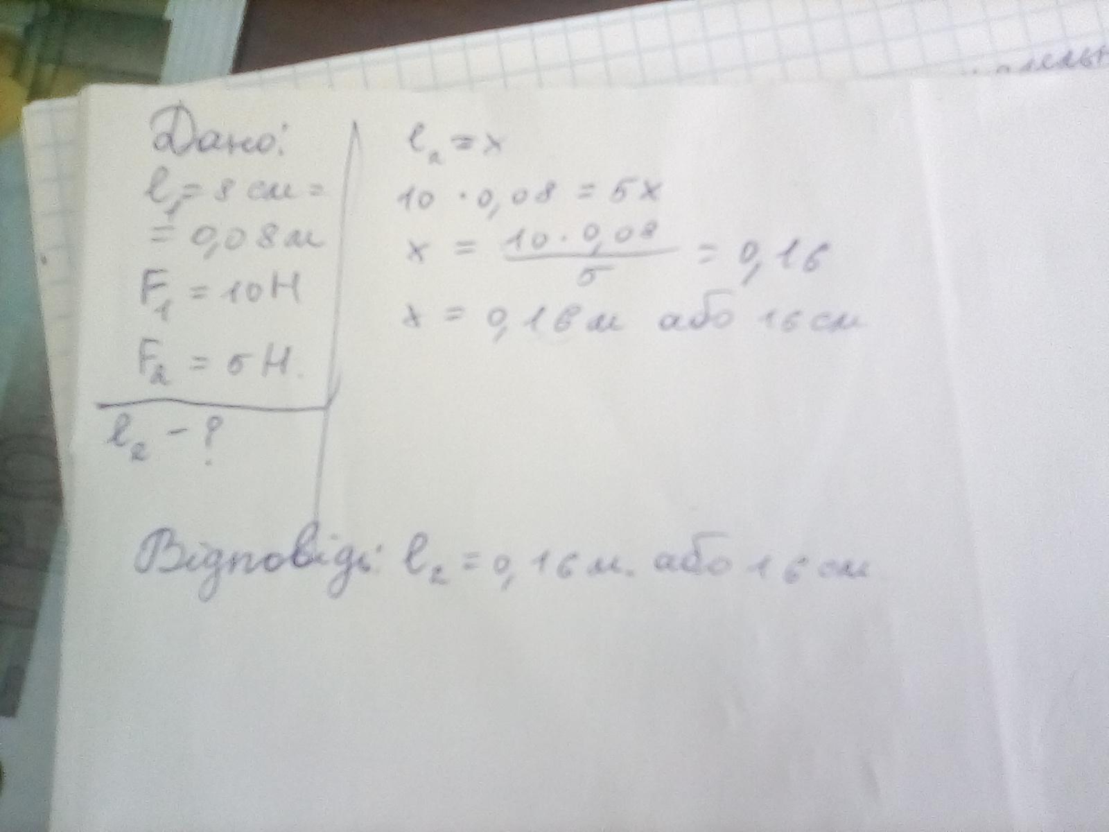 до одного з плечей важеля 8 см завдовжки прикладну силу 10 Н чому дорівнює довжина важеля, якщо до другого плеча прикладено силу 5 Н