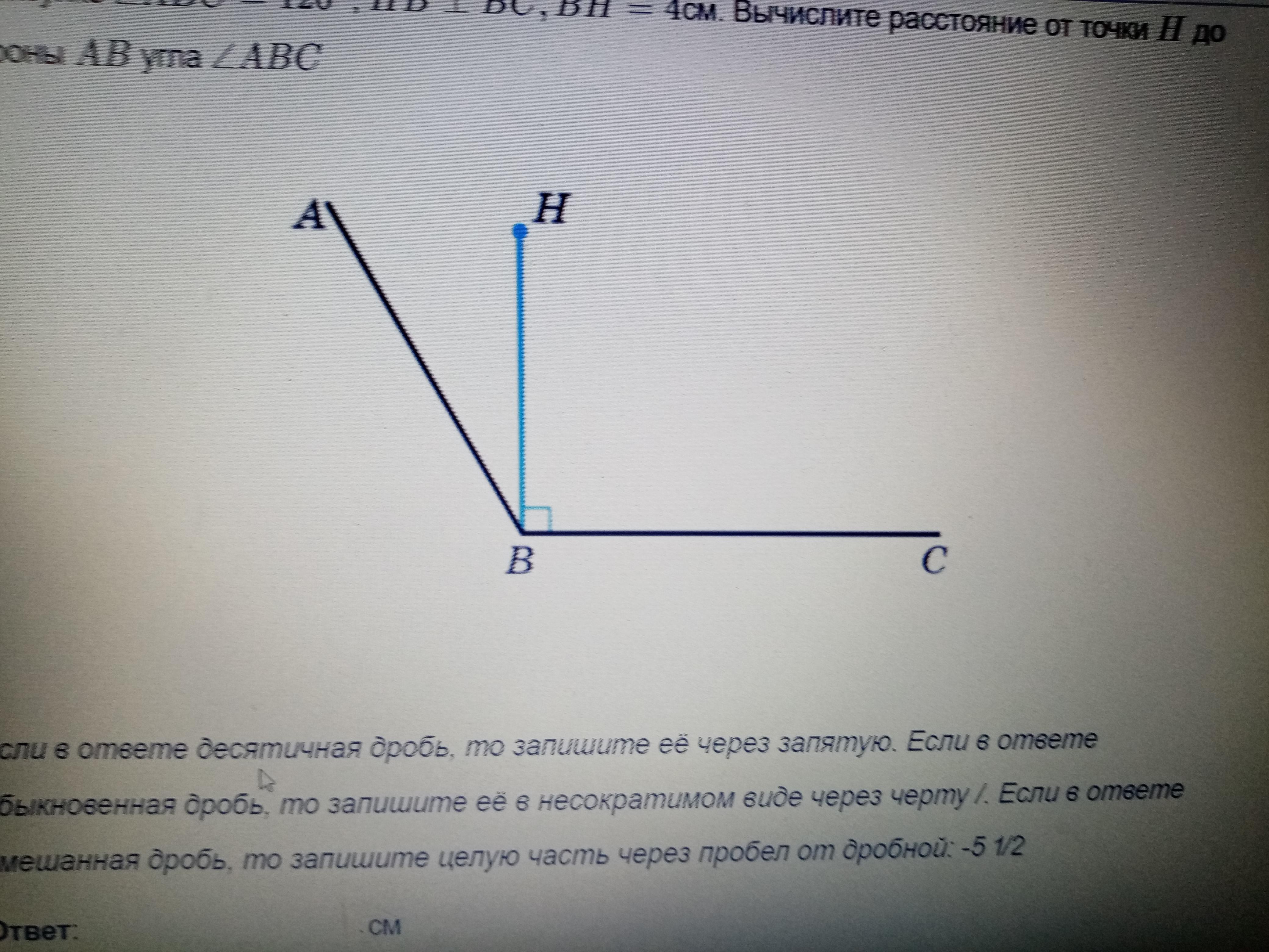 На рисунке ∠ABC=120. HB BC, BH=4HB⊥BC,BH=4см. Вычислите расстояние от точки HH до стороны ABAB угла ABC∠ABC