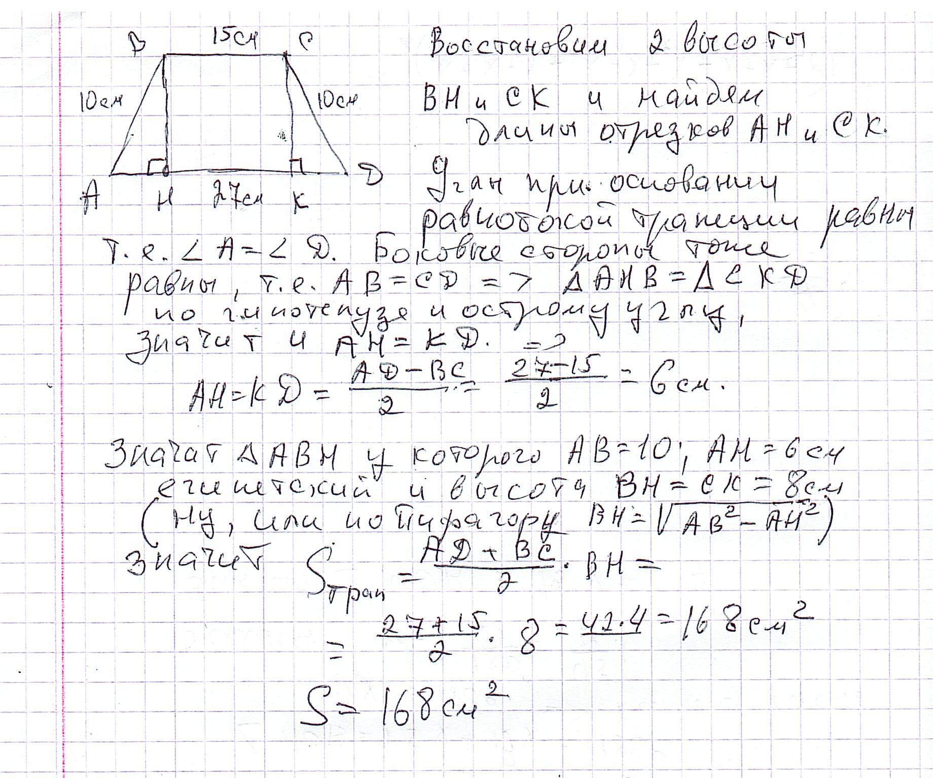 Основи рівнобічної трапеції дорівнюють 15 см і 27 см, а бічна сторона - 10 см. Знайдіть площу трапеції.