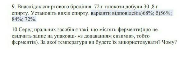 9. В результате спиртового брожения 72 г глюкозы добыли 30,8г спирта. Установите выход спирта. варианты ответов