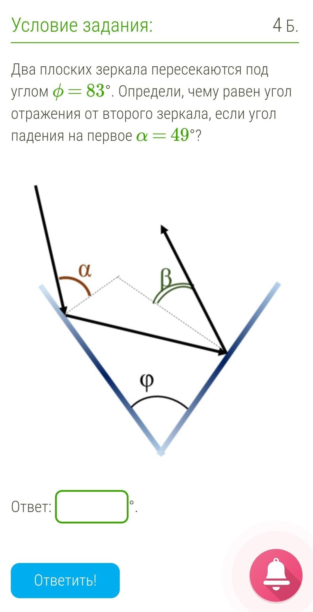 Два плоских зеркала пересекаются под углом ϕ = 83°. Определи, чему равен угол отражения от второго зеркала, если угол падения на первое α = 49°?