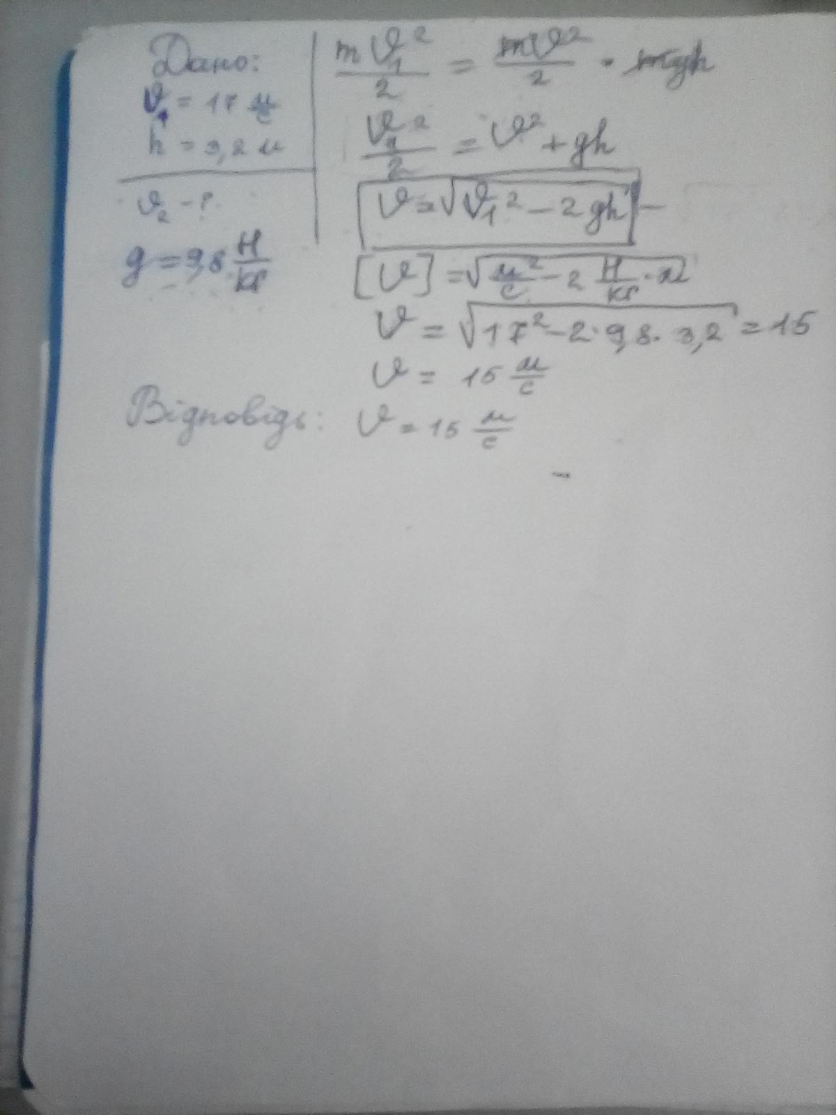 швидкості руху υ о = 17 м/с. Визначити швидкість υ руху каменя на висоті 3,2 м.