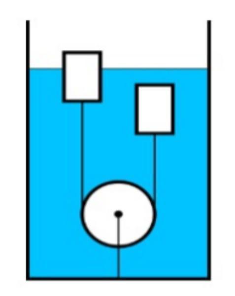 В цилиндрическом сосуде с площадью дна S=0,5 м2 находится вода с плотностью ρ=1000 кг/м3. Через блок, прикрепленный ко дну сосуда, перекинута нить, к концам которой прикреплены два тела с плотностью меньшей, чем у воды. Объем каждого тела равен V=0,05 м3. Плотности тел равны ρ1=500 кг/м3 и ρ2=600 кг/м3. Одно из тел полностью погружено в воду, а часть другого тела выступает над водой (см. рисунок). На сколько изменится уровень воды в сосуде, когда нить, соединяющая тела, порвется и они оба всплывут на поверхность воды? Ответ выразите в cм, округлив до десятых. Трение между блоком и нитью отсутствует. Нити и блок считайте невесомыми.