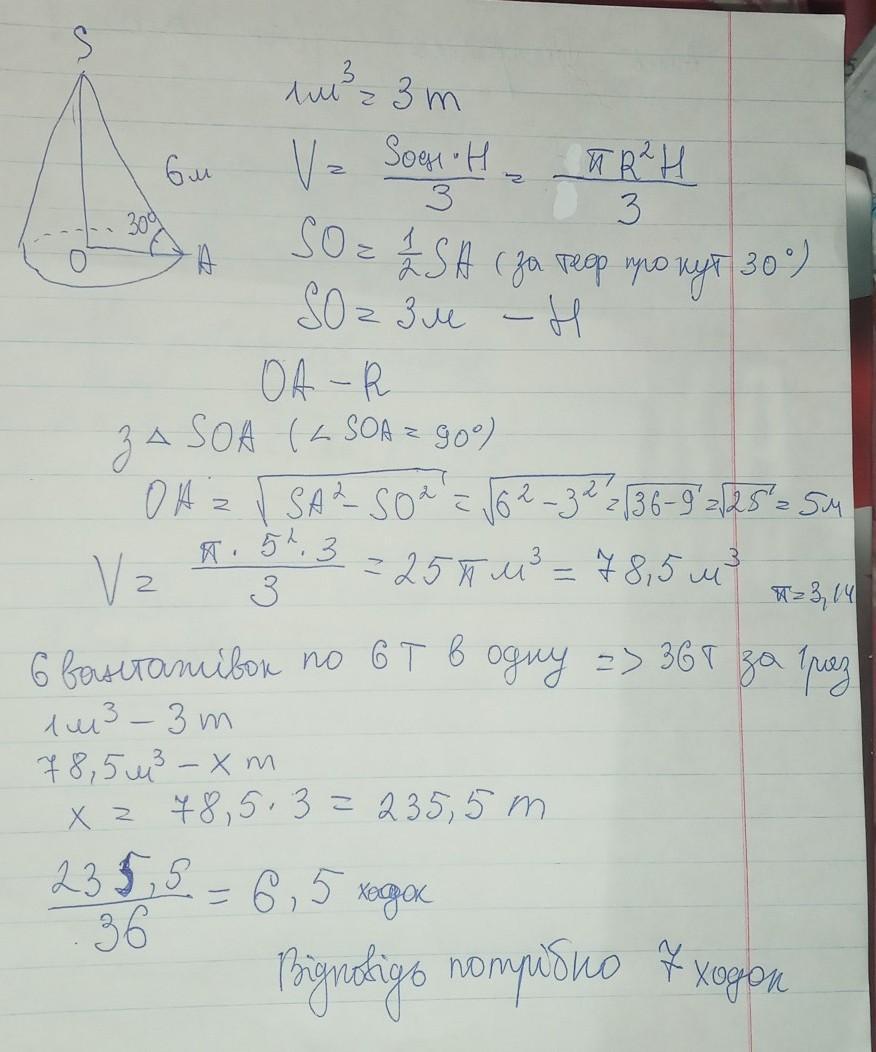 Купа щебню має форму конуса з твірною 6 м. Скільки ходок потрібно зробити шістьма 6-тонними вантажівками, щоб привезти таку купу, якщо ві домо, що кут природного ухилу (тобто кут нахилу твiрної до площини основи) для щебня становить 30°, а 1 м3 щебня важить 3 т.
