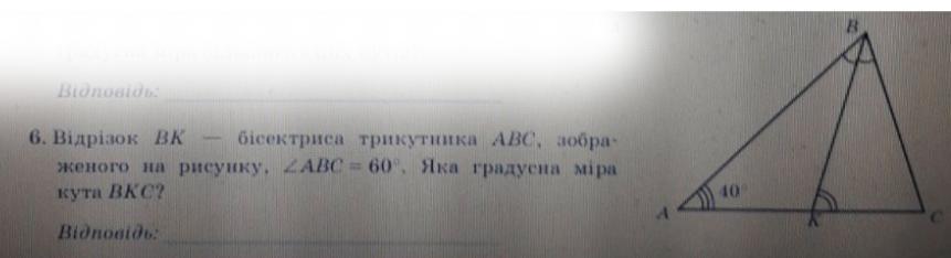 так як бісектриса ділить кут навпіл, то кут КВС=кутАВК. За умовою задачі весь кут В 60градусів тобто кутАВК=кутКВС=30градусів. Розглянемо трикутник АВК , кутАКВ=180градусів- (кутАВК + кутА ) =180градусів -70градусів=110градусів.