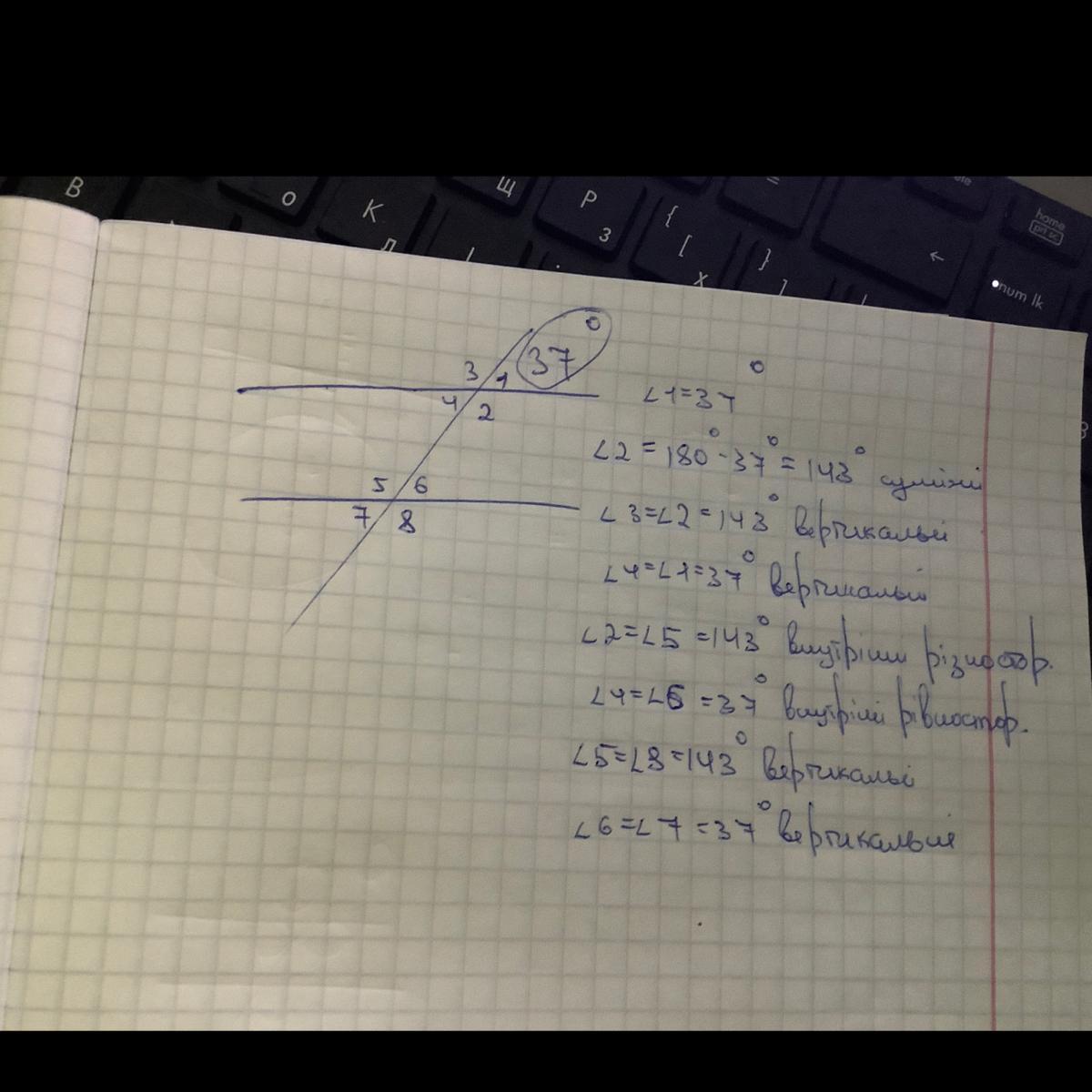 Один із кутів, утворених при перетині двох паралельних прямих третьою, дорівнює 37⁰. Знайти величини решти кутів, що утворились.