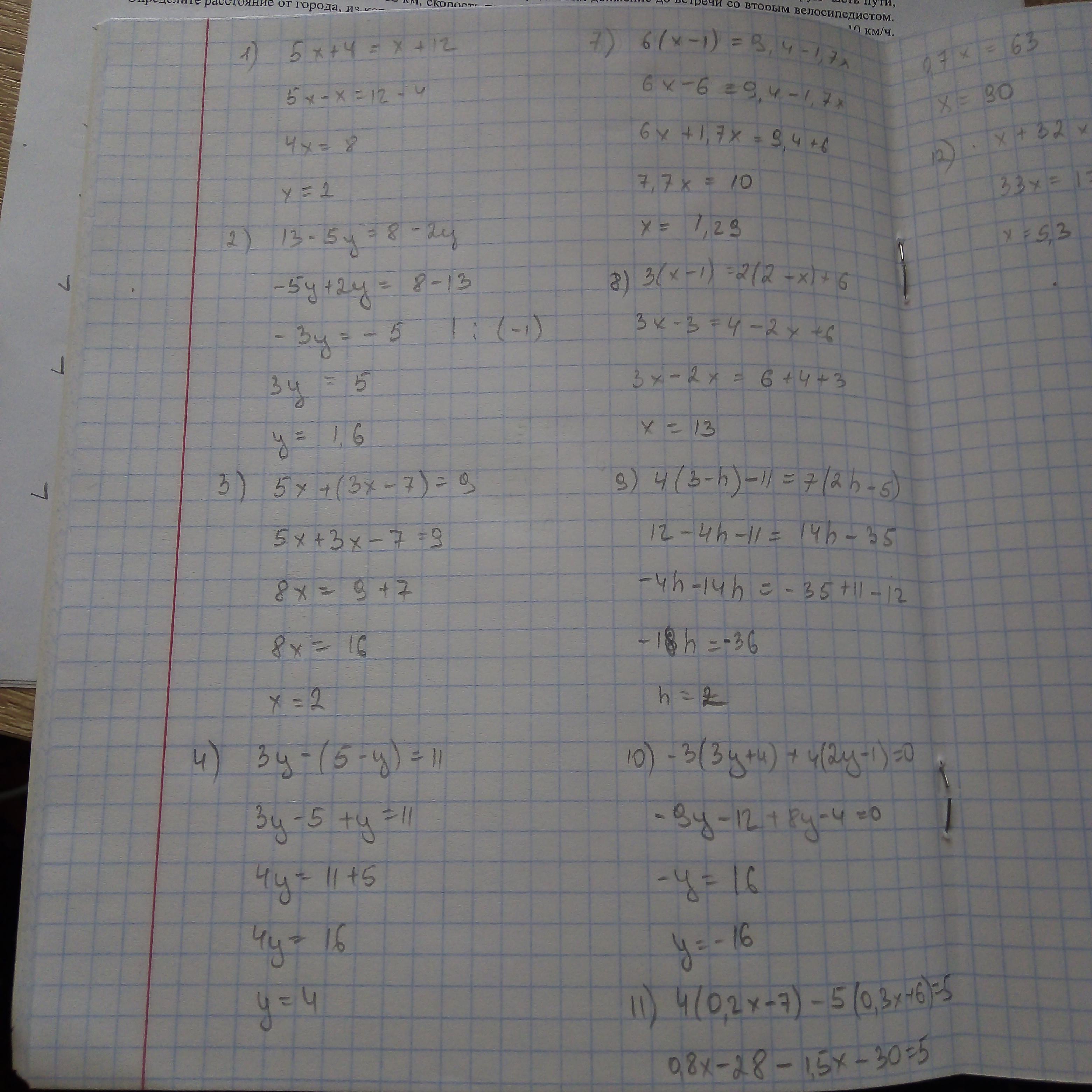 Решите уравнения. 1. 5x + 4 = x + 12 2. 13 - 5y = 8 - 2y 3. 5x + (3x - 7) = 9 4. 4. 3y - (5 - y) = 11 5. 2x + 5 = 2(x + 1) + 11 6. 15(v + 2) - 30 = 15v 7. 6(x - 1) = 9,4 - 1,7x 8. 3(x - 1) = 2(2 - x) + 6 9. 4(3 - h) - 11 = 7(2h- 5) 10. -3(3y + 4) + 4(2y - 1) = 0 11. 4(0,2x - 7) - 5(0,3x + 6) = 5 12. x + 3 2 x - 1 7 5 срочно