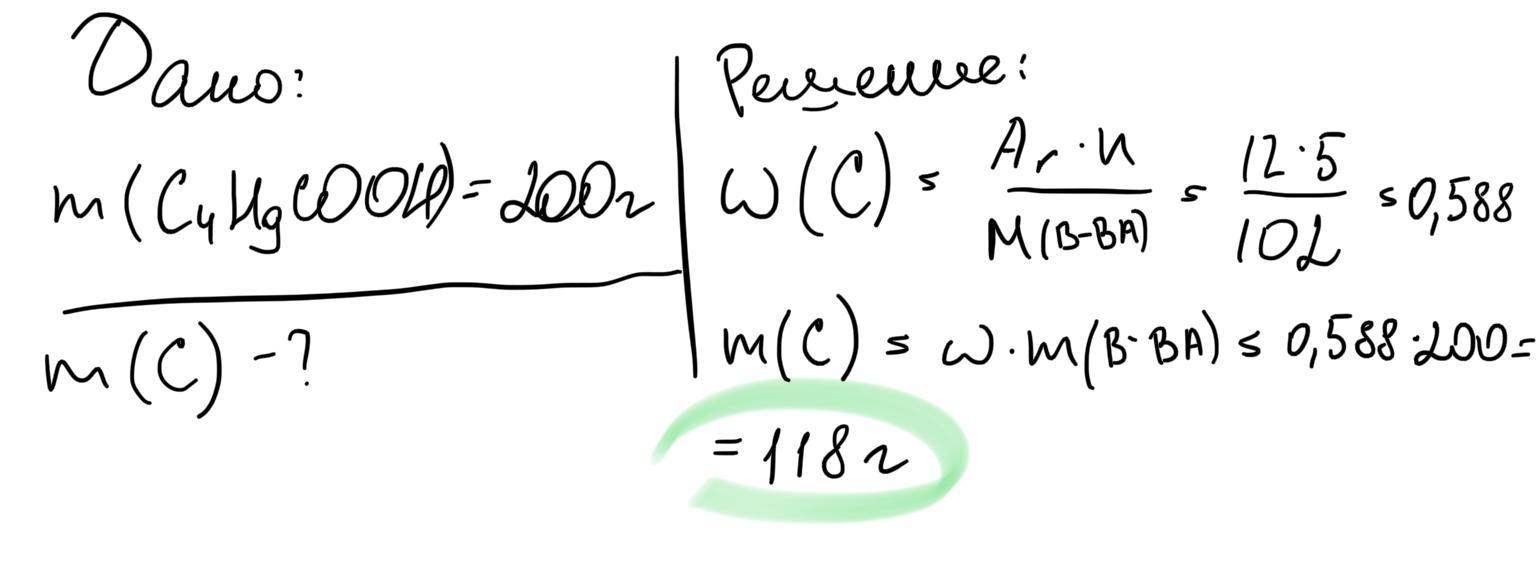 Вычисли массу углерода, содержащегося в карбоновой кислоте C4H9COOH массой 200 г.Промежуточные вычисления проводи с точностью до тысячных. Ответ округли до целых.